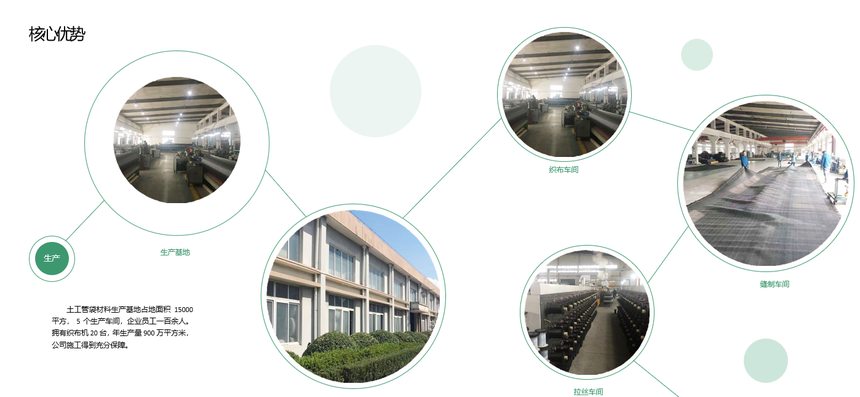 土工管袋材料生产基地占地面积 15000 平方, 5 个生产车间,企业员工一百余人。 拥有织布机 20 台,年生产量 900 万平方米, 公司施工得到充分保障。拥有 200 多名具有多年施工经验的施工团队是我司各项目顺利实施的核心力量。